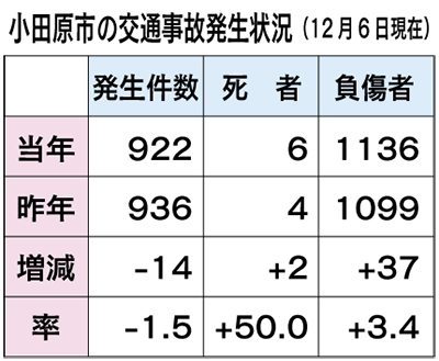 小田原市内では11月の一ヶ月だけで3件の死亡事故が発生。年末の交通事故防止運動(12月11日(日)から20日(火))を前に、小田原警察署(小笠原晃署長)は注意を呼びかけている。