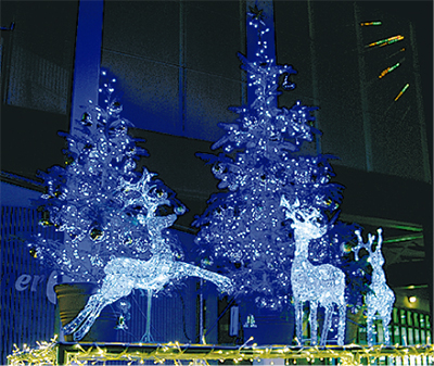 昨年に引き続き、入り口では、イルミネーションの眩い光が地元の人の目を楽しませている。電球の間引きやグリーンカーテンなど、節電対策に力を入れてきた同店では、電飾も省エネのLEDに。雪国をイメージした青白い光が幻想的だ。