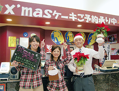 もうすぐクリスマス。市内久野のパチンコ店、スーパーグランドビューでは、サンタクロースに扮したスタッフが自宅にクリスマスケーキを届けてくれるという、粋なサービスを実施する。ケーキは地元の人気菓子店「スウィート・ベリー」のデコレーションケーキで、お届けは24日(土)もしくは25日(日)。現在予約を受付中で、23日(金)は店頭のみの販売となる。