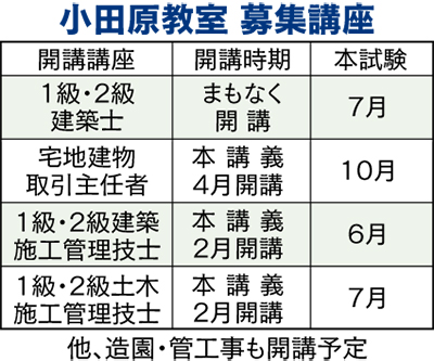 宅建、建築士や施工管理技士の今年度合格を目指す日建学院小田原教室の講座がスタートする。講座によってはまもなく開講を迎えるため、小田原教室では早めの申込みを呼びかけている。