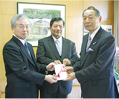 昨年12月27日、(株)ハシモト(橋本槇雄社長)と酪農王国(株)オラッチェ(片野敏和代表取締役)が、「箱根七湯ビール」の売上金の一部、現金10万円を箱根町(山口昇士町長)に寄付した。「箱根七湯ビール」は酪農王国オラッチェ(株)が製造し、(株)ハシモトが流通を担うご当地ビール。片野氏は「七湯ビール発売から一年のお礼の気持ち。箱根町の緑化事業に役立ててほしい」と話した。