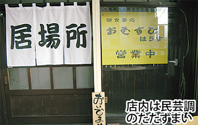 昼開店の「おむすびはうす」。味が自慢の新潟米に香り高い海苔。梅干、鮭、筋子等9種類、150円〜。味噌汁も150円〜で、野菜は有機無農薬野菜が。夜は居酒屋・居場所になる。