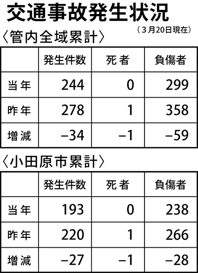 小田原警察署(小笠原晃署長)管内の1市3町(小田原市、箱根町、真鶴町、湯河原町)で、年明けからの死亡事故の発生件数がゼロにとどまっている(3月20日現在)。交通事故の発生件数も減少していることがわかった。