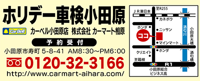 車検完了にかかる時間は、わずか30分〜1時間。不慣れな代車に乗る必要もないので、主婦などに喜ばれている。車検基本料金は1万290円(税込)とリーズナブル。例えば軽自動車の車検総額は5万5135円(公的費用・諸費用込み、部品代金、整備代金別途)。市内寿町にある小田原店((株)カーマート相原)は地元で13年の実績と信頼のあるお店。まずはお気軽にご相談を。