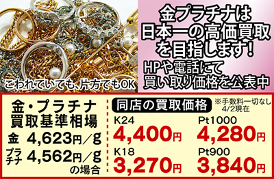 同店HPのアクセスは1日平均50件で、金の実際の買取価格を公表している。情報発信が支持され、毎日見ては高くなると売りに来店する人も多いのだとか。「何%アップ!」に惑わされず、実際の買取価格で比べてみては(要身分証明書)。