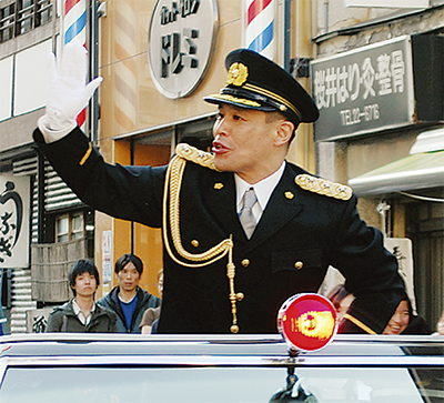 小田原警察署(上田雅人署長)は4月9日に春の交通安全運動を実施。小田原市出身で小田原ふるさと大使でもあるタレントの柳沢慎吾さんが1日署長に任命され、交通安全パレードが行われた。