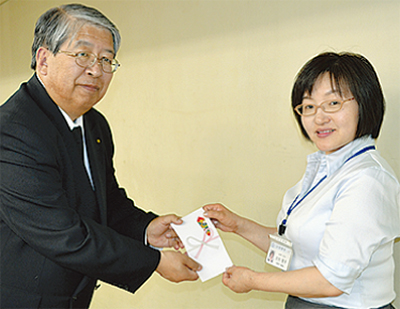 被災地の支援を続けるさがみライフサービス(株)(大塚謙太社長)が今月8日、小田原市役所を訪れ、4万5800円を寄付した。これは、5月20日に同社の成田セレモニーホールで行われたチャリティーコンサートで集まった募金等。