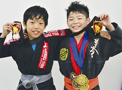 寝技主体の関節技や組技を競う格闘技、ブラジリアン柔術の第6回全日本キッズ選手権大会が16日、都内で行われた。小田原の総合格闘技ジムroots(佐藤ルミナ代表)所属の蘆名(あしな)篤(あつ)くん(黄橙帯/報徳小6年)と立川潤くん(白灰帯/大窪小6年)がジュニアライトフェザー級で優勝。篤くんは第3回大会からの4連覇となった。