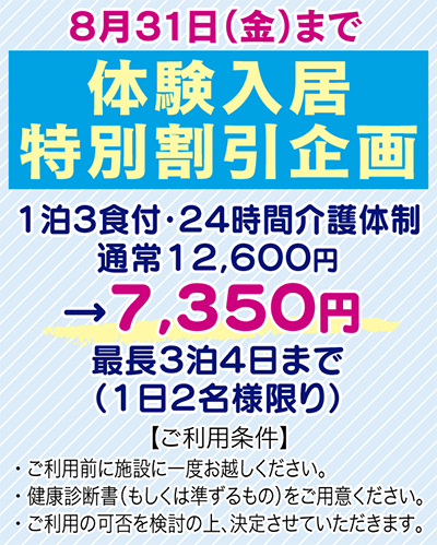 介護付有料老人ホーム「湘南ふれあいの園 小田原」は8月31日(金)まで夏休み期間のみ「体験入居特別割引企画」を実施している。
