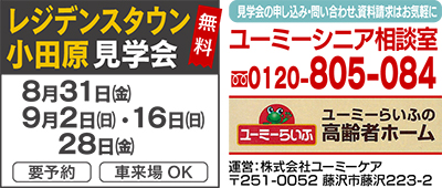 介護付有料老人ホーム「レジデンスタウン小田原」で8月31日(金)、9月2日(日)、16日(日)、28日(金)の4日間、無料見学会を開催する。
