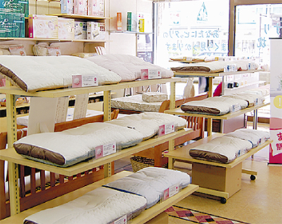 同店の最大の特長は自店で行う羽毛ふとんのリフォーム。「羽毛が片寄っている」「薄くなり温かくなくなった」など、毎日の使用で気になる悩みを石山店長が解決!1枚1枚を店長自ら点検、中羽毛を取り出し必要に応じて洗浄や乾燥消毒も施してくれるので、新品同様ふかふかに生まれ変わる。