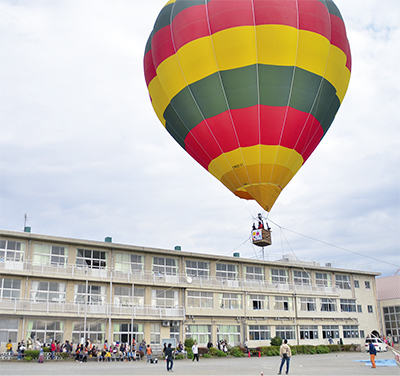 メーンイベントの熱気球事業は順番待ちが出るほどの大盛況。校舎よりも高くあがった気球に乗った生徒からは「高〜い、凄〜い」と感嘆の声があがり、必死に手を振っていた。他にも飲食ブースの出店やペタンク大会、大道芸人のショーなども行われた。宮内校長は「気球のように、子ども達には夢や希望も高く持ってほしい」とコメントした。