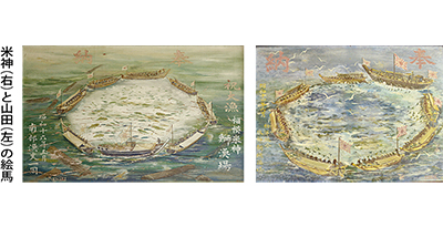 山田町の絵馬には「奉納 祝大漁 相模米神 鰤漁場 昭和十六年五月 南部漁夫一同」、米神の絵馬には「奉納 昭和十四年六月 相洋組合 米神鰤網漁場」と記されている。どちらの絵馬も大漁の魚を囲むように、旭日旗を掲げた船が輪になり、網を曳いている様が描かれている。