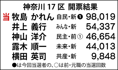 16日投票の衆議院議員選挙が即日開票され、小田原市を含む3市8町の神奈川17区は、自民党の牧島かれん氏(36)が9万8019票を獲得し、2度目の挑戦で初当選を果たした。次点はみんなの党の井上義行氏(49)。井上氏は5万5435票で、比例復活はかなわなかった。