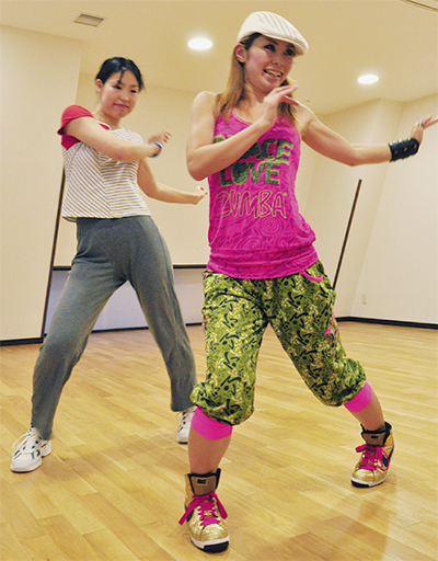 ヨガで体を温めた後は、「とにかく楽しい」と人気のズンバに挑戦。「ダンスは初めて」と緊張気味だった多喜さんも、軽快な音楽に自然と体が動く。「初心者の人がほとんど。まずは鏡を見ながら真似してみてください」とインストラクターの岩本奈穂先生。右へ、左へと体をひねり、ステップを刻む。「効率よく脂肪を燃焼し、ウエストやお尻、太もものシェイプアップに効果的です」。