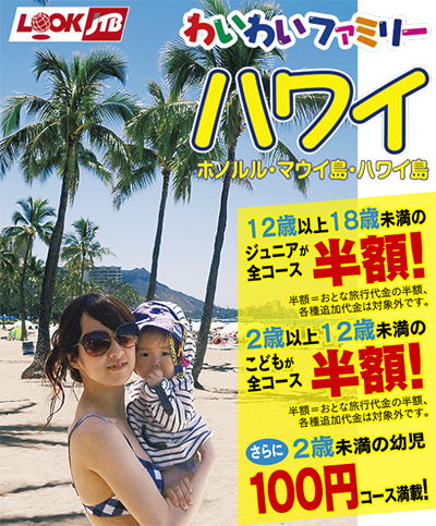 夏休みの家族旅行に人気なのが、LOOK JTBの特別企画「わいわいファミリー」。ホノルル、マウイ島、ハワイ島など、ハワイ旅行の様々なプランが、なんと18歳未満半額に。一般的には3万5000円程度かかる2歳未満の旅行代金は、たったの100円でOK。旅行代金には全コース、航空運賃、燃油サーチャージも含まれており、60日前、35日前までの予約完了で、さらに1人につき4000円から7000円の割引となる。
