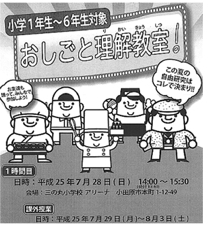 (社)小田原青年会議所(以下、小田原JC・佐藤友彦理事長)は、夏休みを利用して小学生に、仕事体験を通じ、様々な学びを得てもらおうと「おしごと理解教室!」を開催、現在参加者を募集している。
