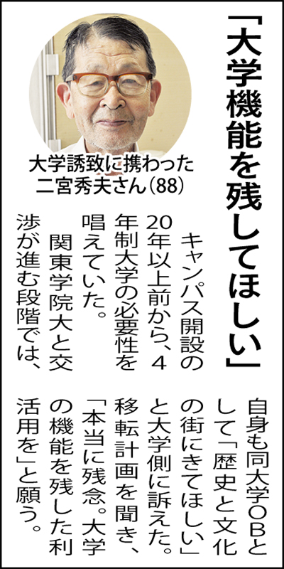 栄町の呉服店・そびそ二宮の二宮秀夫さんは「小田原に大学を、という動きが住民の間で広がっていった」と当時を振り返る。そして1979年、市民の声を受けるかたちで商工会議所などが「大学誘致研究会」を発足。その後、学識経験者らも参加して大学誘致へ大きく舵を切っていった。当時、市の職員として誘致を担当した大野速雄副市長は、「存続してほしいが、難しい場合でも転用などを含め、前向きな方向に進むことを期待したい」。