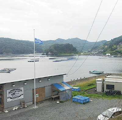 義援金の一部を活用して、カキ小屋「唐桑番屋」前に、津波の高さを示すポールが建てられた。海抜13mの部分には「大津波到達点」と書かれた旗が掲げられている。「今後は海産物を小田原で販売することでも、支援を続けていきたい」と、鈴木社長は話している。