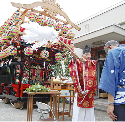 修繕作業が完了した上曽我地区の山車が8月3日、中河原公民館でお披露目され、安全祈願祭が行われた。