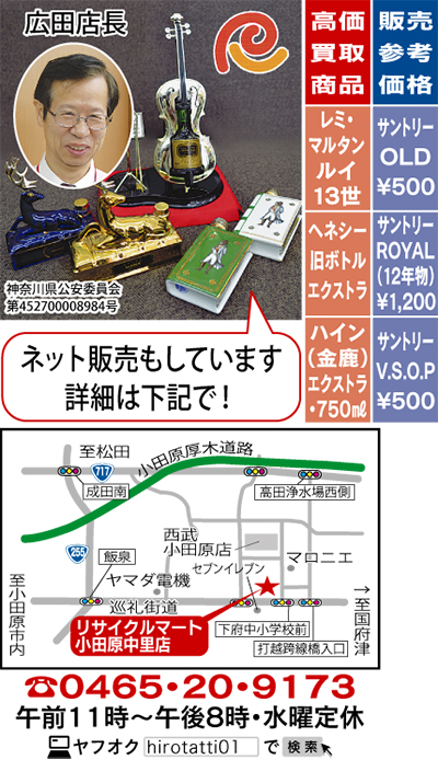 食糧庫に寝かせっぱなしのお酒がある方、多いのでは?飲まずに置いておくのはもったいない。そのお酒を買取ってくれるのが、西武小田原店すぐ、巡礼街道沿いのリサイクルマート小田原中里店だ。様々な種類の酒を、中古価格で好評買取り中(未開封に限る。ワイン、炭酸系アルコール、日本酒の一升瓶など買取れないものもあり)。高値が付く可能性があるお酒もこっそり教えてもらったので、左記の表を参照してみて。