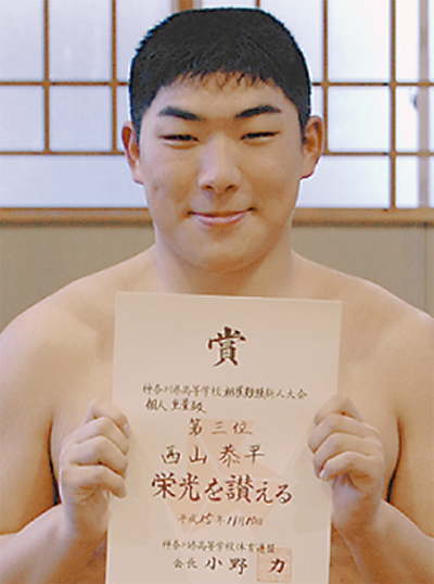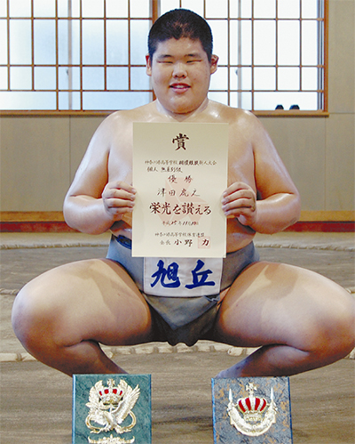 新名学園旭丘高等学校(水野浩校長)相撲部の津田虎之君(2年)が、11月に行われた全国高等学校相撲新人選手権大会の神奈川県予選で優勝した。津田君は来年3月、高知県で行われる全国大会に出場する。