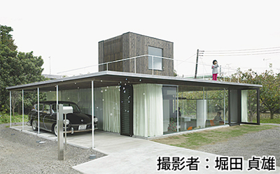 設計監理を担当した野地智美さん(35)は市内田島在住。木造2階建て、約27坪の邸宅は、床高を70cm掘り下げ、座った時や台所での作業中の目線が柿の幹の高さにくる工夫や、全面ガラス張りにすることで隣地の柿畑と調和を図った。また稼働式の仕切りで部屋のレイアウトも自由に変更できる機能面も配慮。暦にもこだわり、構想から完成まで約3年を要した。