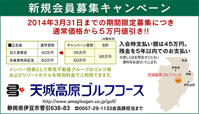 日本一のコース設計家といわれる巨匠・井上誠一氏が手掛けた天城高原ゴルフコース。丘陵の地形を生かした設計で、雄大な富士をバックにプレーができる、まさに天空のゴルフ場だ。夏の平均気温19・6℃という暑さ知らずな立地で涼やかな快適ラウンドが可能。伊豆スカイライン天城高原ICから車で15分、東急ゴルフリゾートならではの行き届いたサービスも嬉しい。ただ今新規会員募集中!