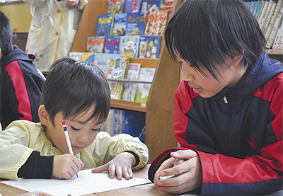園児たちはプリントの見本を見ながら、自分の名前書きに挑戦。平仮名を一字ずつ丁寧に書きうつすと、横では「こうやって持つんだよ」「上手だね」と声をかける児童の姿もあった。「早く学校に行きたい」と笑顔の園児を前に、田代航士(こうじ)君は「上手に書けていた。学校が楽しいと思ってくれて良かった」とほっとした表情をみせていた。