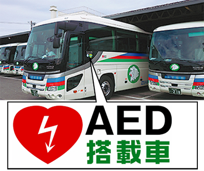 同社の貸切バスは、医療機関が少ない観光地への出動をはじめ、高速道路を使用しての移動や高齢者の利用が多いことから安全対策の一環としてAED搭載に踏み切った。