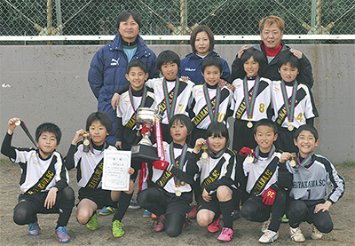 県内8チームが参加した大会は、決勝戦で地元の早川とSKJ-FCが対戦。好機をものにした早川が3対0でSKJを下した。主将の太田光紀君は「優勝できてうれしい」と話し、決勝で2得点の後藤康介君は「みんなからのパスを決められてよかった」と喜んだ。