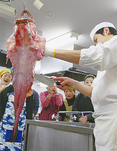 子育て世代をはじめ、約10人が参加。この日の朝に小田原漁港で揚がったアンコウが使われた。講師の檜山大亮さんが各部位の説明をしながら豪快に魚を下ろすと、参加者からは驚きの声があがった。その後、アンコウ鍋と、肝を使った友合えに挑戦。市内から参加した神保光子さんは「おいしくできた。高級魚のイメージがあるが、家でもつくってみたい」と話した。