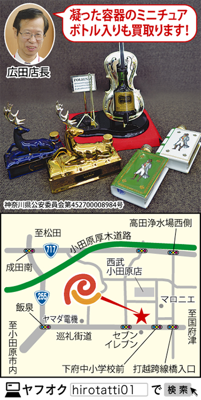 巡礼街道沿い、下府中小学校前交差点すぐ「リサイクルマート小田原中里店」では、ウイスキーやブランデーなどの酒類を中古価格で買取り中(未開封のみ。ワインは買取り不可)。「レミ・マルタンのルイ13世、ヘネシーのエクストラなどは大歓迎!ネットで出品もしています」と広田店長。