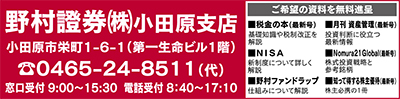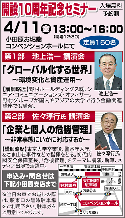 野村證券株式会社小田原支店が3月22日、オープン10周年を迎えた。4月には、近隣の人々を招いて記念セミナーを開催するなど、地域と共に歩む同社を紹介する。