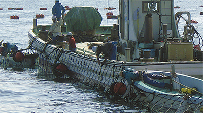 網は中規模型定置網で、予算は約3億円。水深40m以上、沖測長305mと、以前の物よりも大きくなっている。急潮対策として、2ノットの潮流に耐えられるようワイヤーと錨を増強。また、最終的に魚が溜まる金庫網が二重になっており、網に入った魚がまた外に出にくくする工夫がされている。