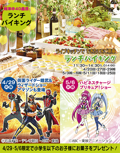 箱根湯本の天成園では4月29日(火・祝)と5月6日(火・祝)に、子どもたちに大人気のキャラクターショーを開催する。29日は仮面ライダー鎧武&ウィザードとアマゾンが、6日にはハピネスチャージプリキュアが登場。本格的な音響、照明の演出がさらなる興奮を呼ぶ。両日ともに午後1時からと、4時からの2回公演。撮影会や握手会、グッズの販売も行われる。