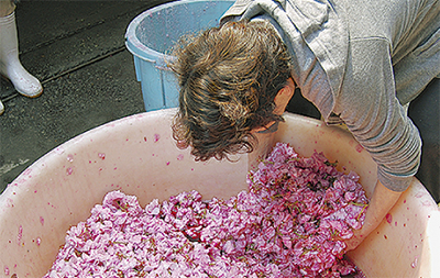 同社3代目の飯島清嗣社長は「赤みの残る花を収穫し、一気に漬け込まなくてはいけないので、時間が勝負。今年はなかなか暖かくならなかったので花の開きが遅く、苦労した」と話していた。