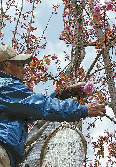 蒲鉾、梅干し、干物など数多い小田原の名産品の中でも全国シェアの約9割を誇る桜花漬け。先ごろ原料となる八重桜「関山」が満開になり、収穫のピークを迎えた。今年は天候の影響で例年よりやや遅めの収穫となった。