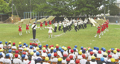 当日は児童・保護者ら約350人が参加。菅谷穂乃さん(6年)が指揮者を務め、音楽隊の演奏に合わせて全校児童239人が校歌を斉唱した。菅谷さんは「みんなと息を合わせてできた」と話した。
