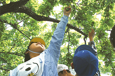 三の丸小学校(瀧本朝光校長)の5年生80人が6月4日、小田原城址公園内で梅もぎを行った。