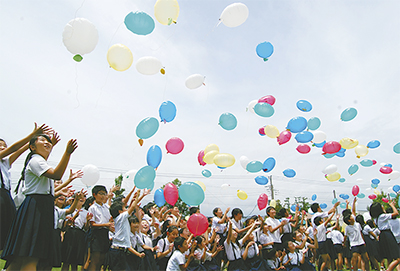式典には加藤憲一市長をはじめ、歴代の校長、PTA会長、自治会長、児童委員らが来賓として参加。同窓会、PTA、学校などから児童たちに記念品が贈られた。児童たちはお返しに「学校」にお祝いの言葉を贈った。式典後には、全校児童でメッセージのついた風船を飛ばし、100歳の誕生日を祝った。