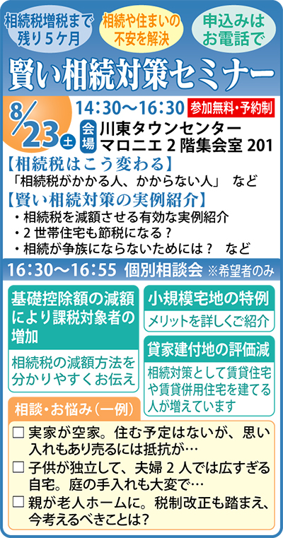 セミナーでは相続税増税基礎やポイント、注意点などをやさしく解説するほか「実家が空家…」「子が戻るか未定だが、相続のことも考えて良い方法を取りたい」など、身近な実例を取り上げ、その対策方法などを多数紹介する。参加者からは「大変分かりやすい」と好評のセミナー。役立つ情報も満載なので、ぜひ参加を。