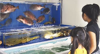 「活魚を扱うことで、最も新鮮な状態で提供できる。見ているだけでも楽しいですよ」と直売所の石井旬さん(31)。来店した堀口明日香さん(9)は「泳いでいる魚をあまり見ることがないので楽しい」と水槽を見つめた。
