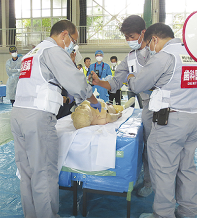 西湘高校会場では、体育館を「多数遺体収容施設」に設定した訓練を実施=写真右。医師や歯科医、警察、市職員らが参加し、遺体収容施設の開設、遺体収容から遺族への引き渡しまでを実践した。市福祉健康部の藤澤隆則保険課長は「今後も多くの職員が実践を積めるよう、積極的に訓練に取り組みたい」と話した。