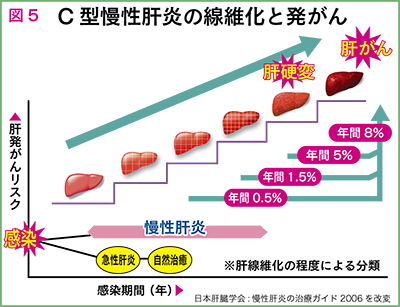 肝機能異常が長期間持続することで肝硬変へ進展し、肝がんの発症にいたる事が多いため、根治を目指したインターフェロンなどによる治療の対象となります(図5参照)。