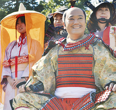 小田原北條太鼓の会による和太鼓演奏や、豊臣対北條甲冑武者対決、お囃子の披露など見て楽しめる企画が盛りだくさん。午前11時半には、歴史公園二の丸特設舞台に、「天下人」豊臣秀吉、淀君、徳川家康、時の人・黒田官兵衛が勢ぞろいする。秀吉に扮するのは小田原ふるさと大使でパティシエの鎧塚俊彦さん=写真右(過去の様子)。