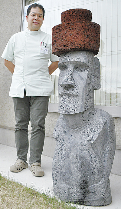 正体は、あの有名なモアイ像。小島時昭院長が今年5月にイースター島を訪れた際「一目惚れした」事がきっかけで、現地で特別に制作してもらったという。