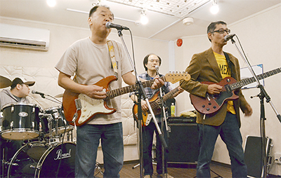 メンバーは、作詞作曲とボーカル担当の相澤知行さん(59・田毎)、相澤さんの甥でドラムの康介さん(33)、ベースの三枝正尚さん(57・若松屋染物店)町田小出身、静岡県沼津市の楽器店勤務でギターの鶴井隆さん(47)の4人。それぞれの仕事が終わった、火曜の夜9時から2時間の練習は、オヤジならではのゆったりした空気が漂う。