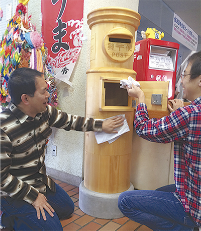 今回は、昨年暮れに相馬市へ寄贈した木製ポストのメンテナンスも行った。1年ぶりにポストに対面した、川瀬潤(ゆたか)さん=写真左=と加藤大(まさる)さん=同右=は、寄贈を企画した小田原市東西郵便局長会の一員。製作した(株)ラ・ルースの相田秀和さんから託された天然オイルで、約20分かけ木肌を何度も磨いた。