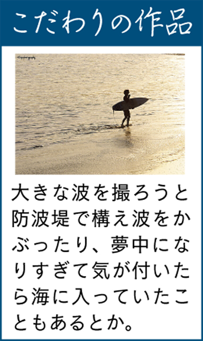 西湘に興味を持ってもらいたい―。その一心で、サーフィン写真だけでなく、風景や人物など、西湘地区の“良いもの”を撮影。「心に響く写真を撮りたい」との思いから、写真ではなく“写心”と呼ぶこだわり。「写真は一瞬だけしか表現できないが、それまでの物語が伝わるようなものを撮りたい」と話す。今日も営業車の傍らに愛機を忍ばせ、地域をまわる。